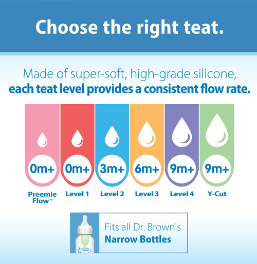 - CONSISTENT FLOW RATE. Vacuum-free feeding is closest to breastfeeding and Dr. Brown’s Slow Flow Nipples provide a consistent flow so babies can feed at their own pace. Each nipple level provides clinical consistency within the flow rate, so baby’s feeding experience is constant and comfortable.