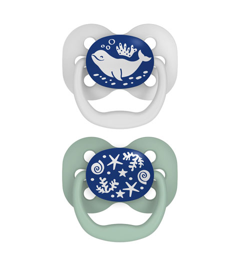 Dr. Brown’s Advantage Pacifier is designed with baby’s acceptance in mind. The Advantage Pacifier is a fully symmetrical soother, with a reversible bulb that can be placed in baby’s mouth in either direction. The 100% silicone bulb is soft yet sturdy with a round shape that satisfies baby’s suckling reflex. A unique open shield design reduces irritation by providing plenty of air for baby’s sensitive skin to breathe. Plus, the fun design is glow-in-the-dark making it easy to find in the dark for nighttime soothing. Advantage Pacifiers come in two stages as baby grows – 0-6m features a smaller bulb and shield for newborns. As baby grows, they can move up to the 6-18m stage, a slightly larger version of the same soothing design. Taste-free, odor-free, and BPA-free. Dishwasher (top rack) and sterilizer safe.