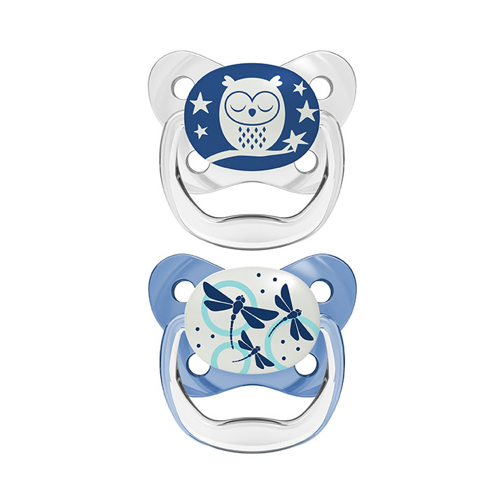 Safe soothing has never been smarter! Dr. Brown’s® PreVent™ Pacifiers are as adorable as they are effective. Designed by a pediatric dentist, the 100% silicone bulb features a patented suction-free air channel and thin bulb stem that reduce pressure inside baby’s mouth, helping prevent dental issues such as posterior crossbite down the road. The glow-in-the-dark pacifier is easy to locate at night – just expose to light to utilize the glow-in-the-dark feature! Prevent Pacifiers have a size for every age, ranging from 0m to 18m. The bulb is taste-free, odorless, and keeps its unique shape over time. The Contoured Shield curves away from baby’s face to reduce the risk of pacifier rash on little cheeks and noses. Prevent Pacifiers are easy to clean and are dishwasher (top rack) and sterilizer safe. Electric sterilization and boiling water only – do not sterilize baby pacifiers in the microwave