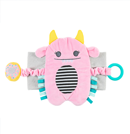 - The super soft material of the swaddle belt is cozy on baby’s belly, while the crinkly ears, accordion arms, and colorful tags engage baby in sensory exploration. An attached, 100% silicone teether soothes sore gums and offers baby another distraction.