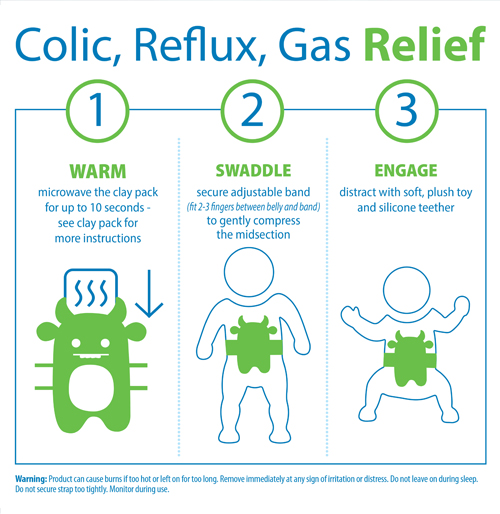 - Simply warm the clay pack in the microwave, secure the adjustable band to gently compress baby’s belly, and engage baby in play. The included clay pack can also be frozen to treat aches and pains.
