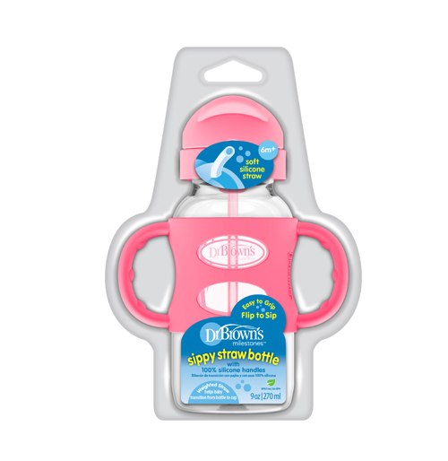 9 oz/270 mL PP W-N Sippy Straw Bottle w/ Silicone Handles, Pink, 1-Pack